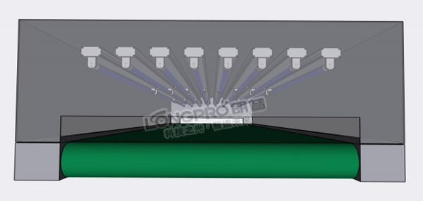 朗普科技(LONGPRO)根據(jù)紫外殺菌劑量(參考GB15981標(biāo)準(zhǔn))要求,選用朗普高強(qiáng)度紫外線殺菌燈HL-840(單燈150W,1m紫外強(qiáng)度:≥580μW/cm2)通過計算所需數(shù)量為8盞,紫外劑量≥ 20,000μW.s/cm2。紫外線燈安裝在輸送線內(nèi)部上方4盞,下方4盞(采用滾軸傳送,便于紫外線有效照射信件底部), 快遞信件在輸送線上勻速通過,紫外線照射時間≥5s,從而快速有效殺菌。